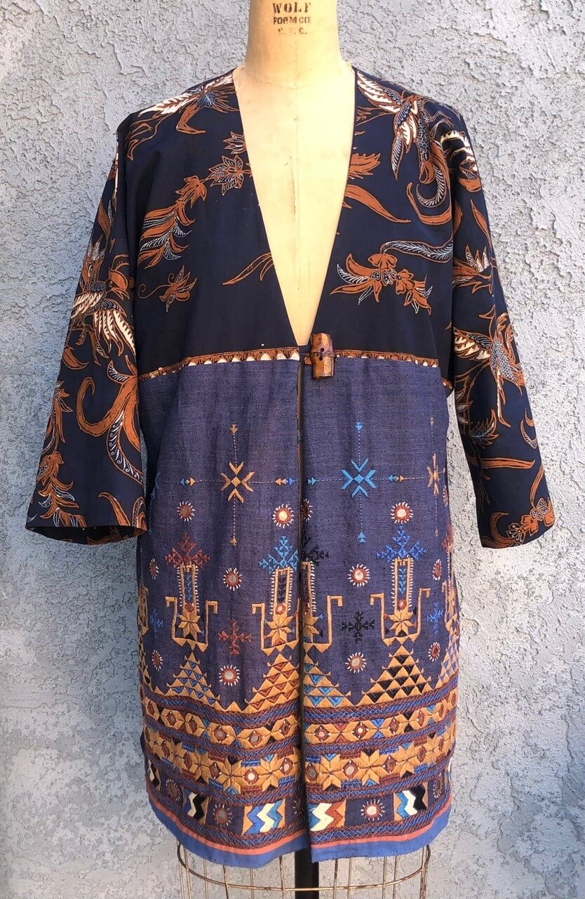 India Indonesia Jacket Deconstructed embroidered skirt from India Batik cotton from Java Bamboo button Lined